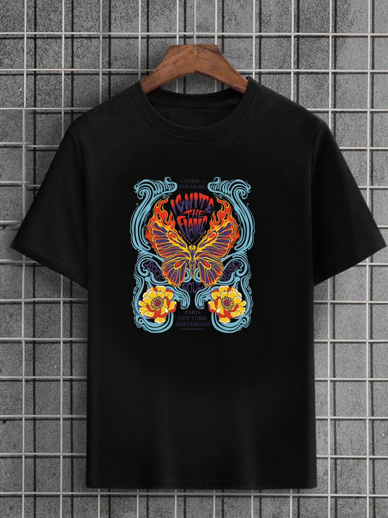 Camiseta Masculina Preta 100% Algodão Butterflies Flame
