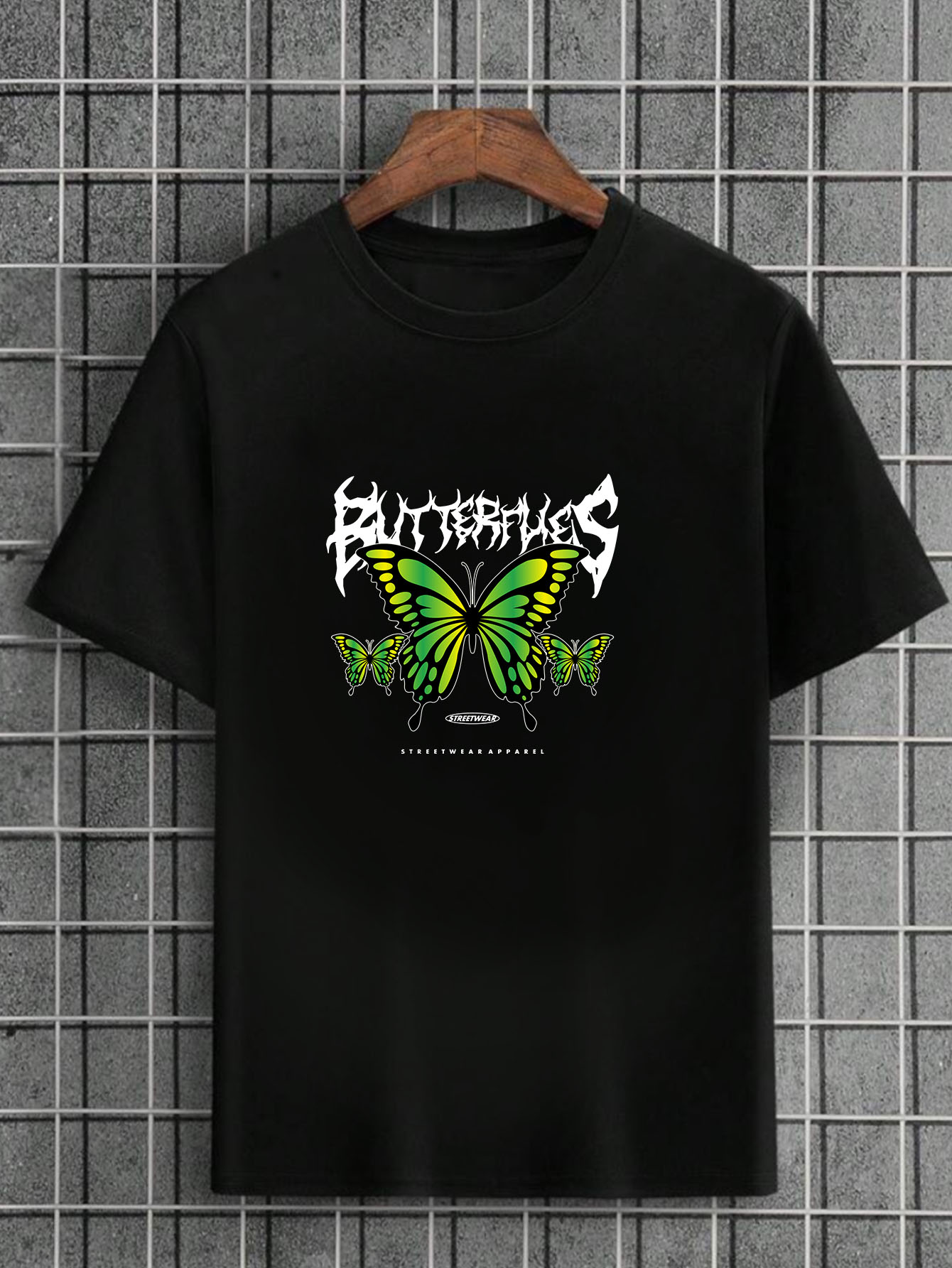 Camiseta Masculina Preta 100% Algodão Butterflies Green