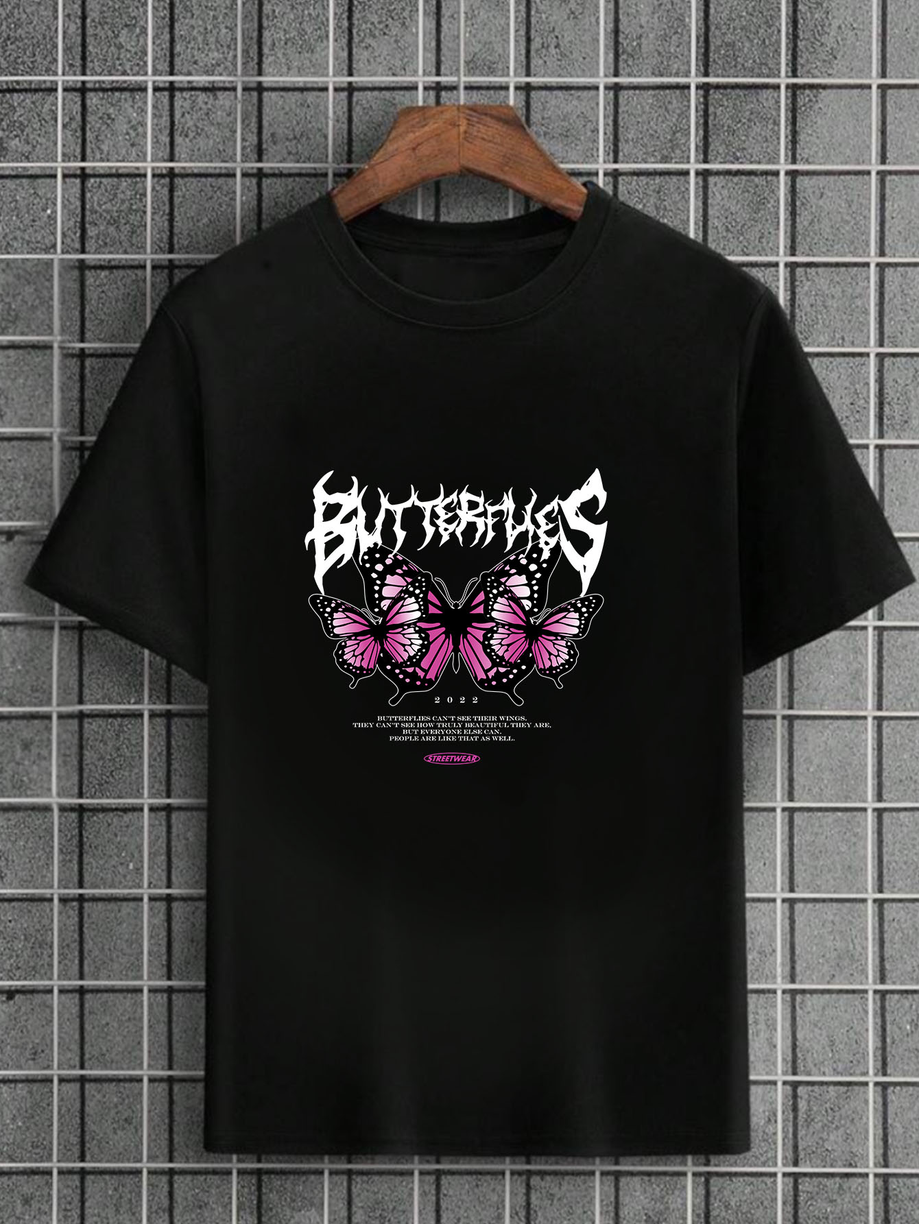 Camiseta Masculina Preta 100% Algodão Butterflies Pink