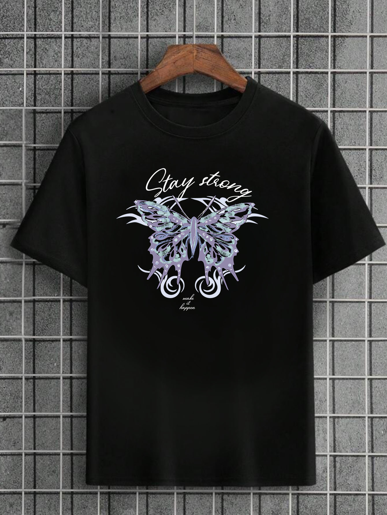 Camiseta Masculina Preta 100% Algodão Butterflies Stay Strong Blue
